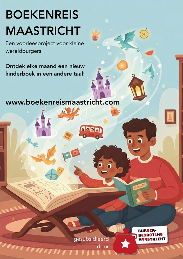 In een internationale stad als Maastricht leven meer dan 130 nationaliteiten vaak naast elkaar in eigen ‘bubbels’. Boekenreis Maastricht brengt hier verandering in. Maandelijks ontdekken kinderen van 4 tot 7 jaar (natuurlijk zijn jongere of oudere broers en zussen ook welkom) een prachtig verhaal in een andere taal, altijd gecombineerd met een Nederlandse vertaling. Terwijl de kinderen in de verhalen duiken, ontmoeten ouders en buurtbewoners elkaar bij een kop koffie en Limburgse vlaai.
